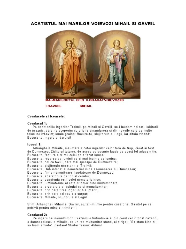Condac 1 celor ce sunt mai marii oştilor îngereşti ale sfintei treimi, sfinţilor arhangheli mihail şi gavriil, noi, iubitorii de praznic, le cerem ajutorul ca ….. S lava tie, dumnezeul nostru, slava tie! A casei, a inimii, a capului, protecţie împotriva oricărui vrăjmaş văzut sau nevăzut. Acatistul sfintilor arhangheli mihail si gavriil. Acatistul sfinților arhangheli mihail și gavriil.. S lava tie, dumnezeul nostru, slava tie!